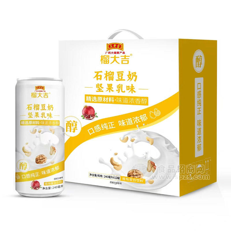 有代理、批发采购榴大吉石榴豆奶坚果乳味植物蛋白饮料饮品招商240ml意向均可与厂家山东美果来食品有限公司联系,沟通洽谈。